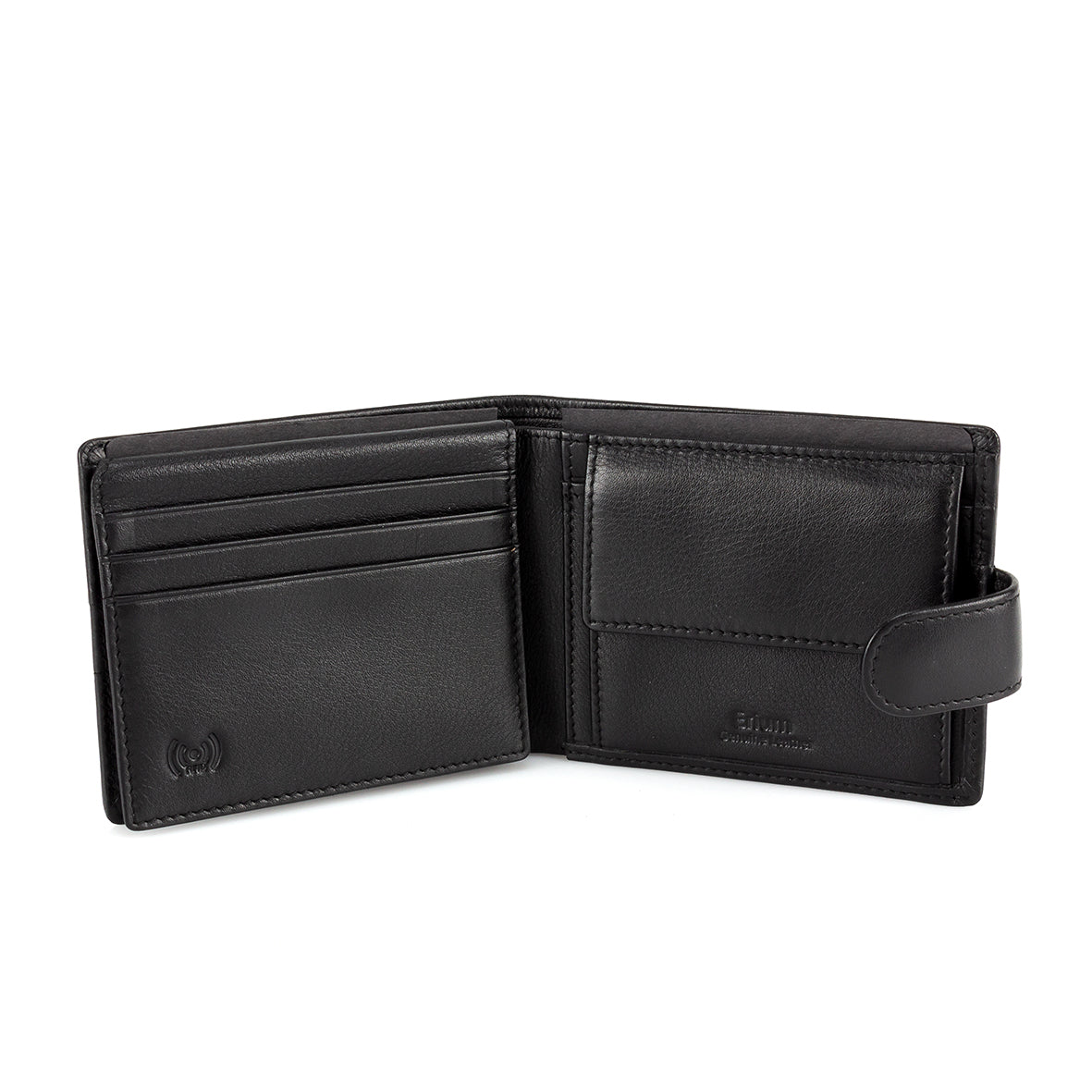 Carteira com presilha, espaço para seis cartões, uma transparência, duas arrumações interiores, um porta-moedas e uma divisão para notas. Com proteção RFID*.