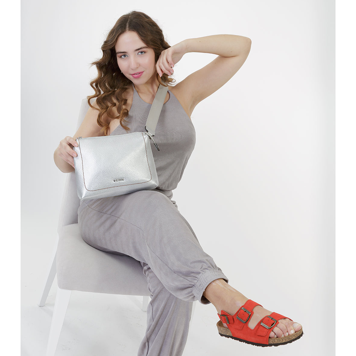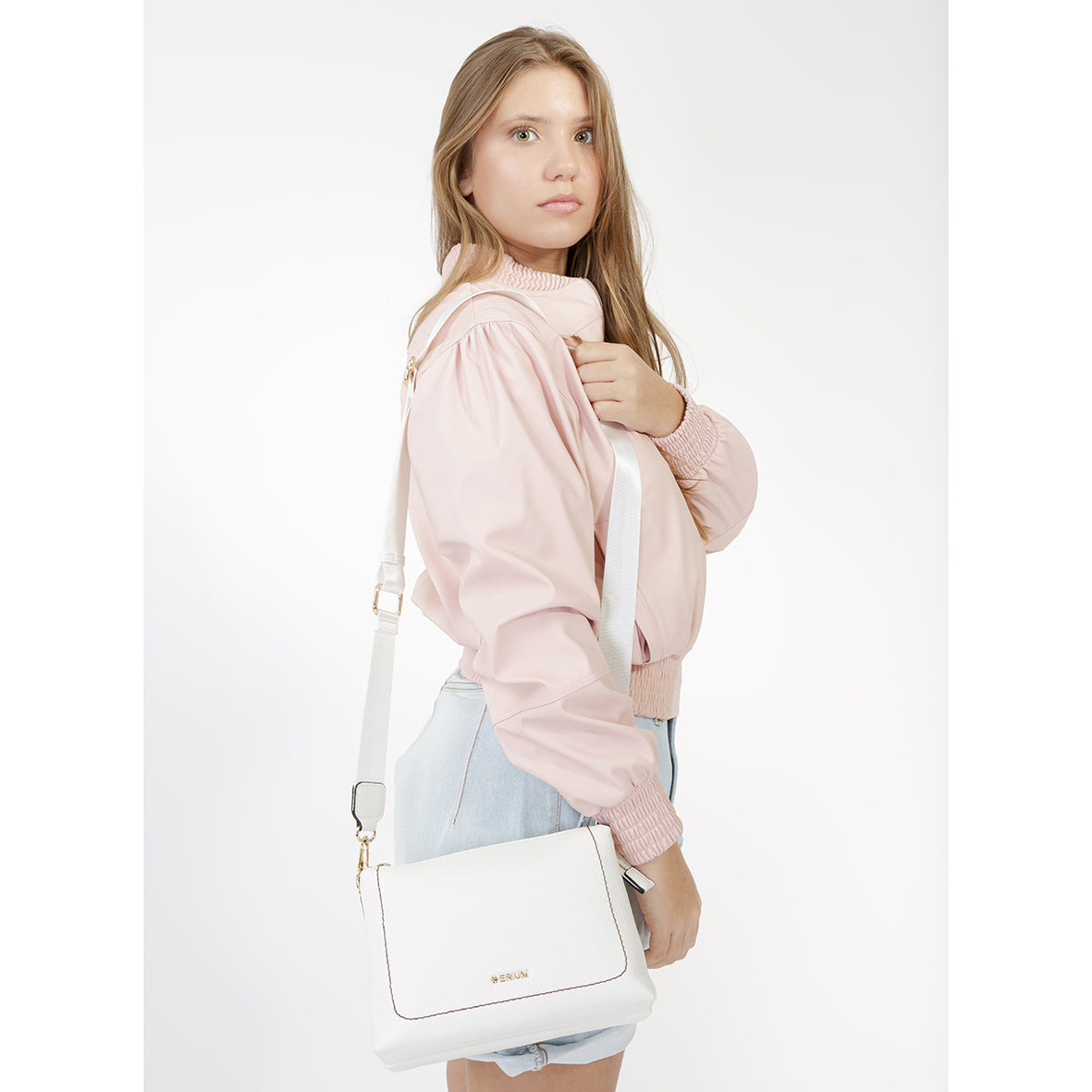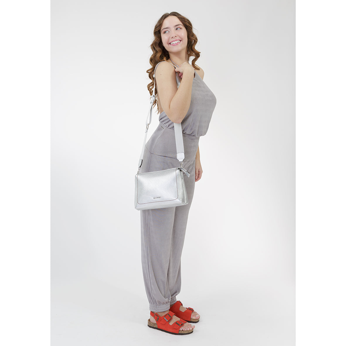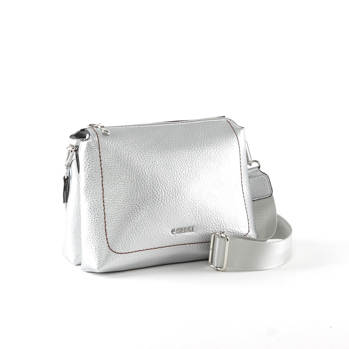Esta mala tiracolo da Erium destaca-se pelo seu acabamento moderno e sofisticado, ideal para quem procura um acessório prático com um toque contemporâneo. Confeccionada em material de alta qualidade com textura granulada e acabamento metalizado, apresenta um visual distinto que eleva qualquer look.