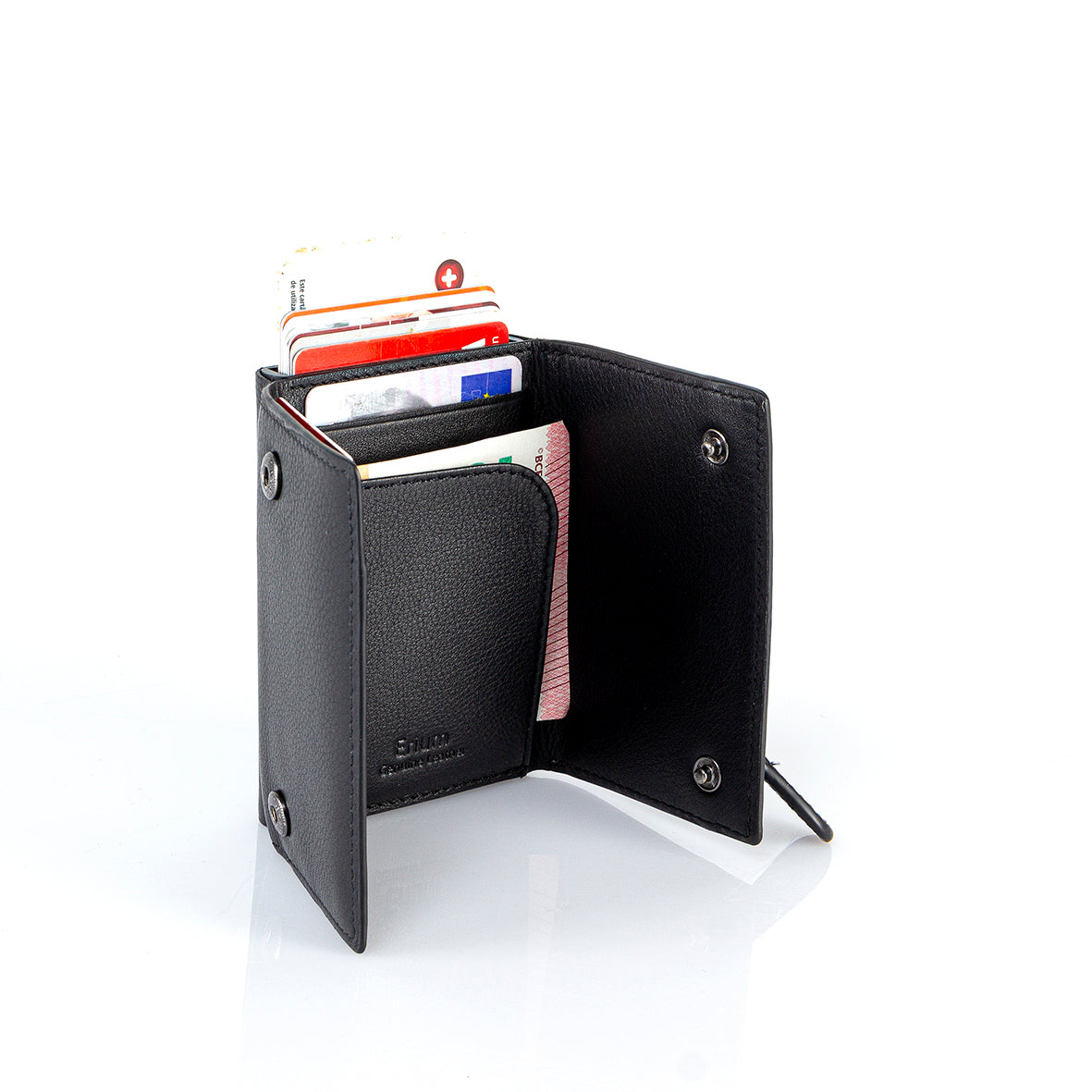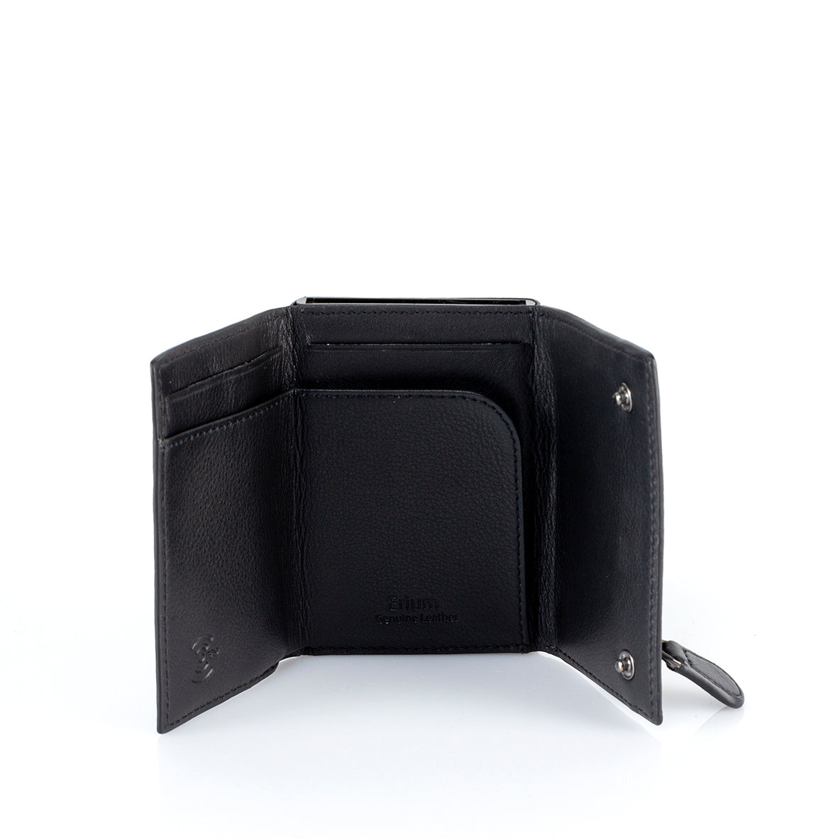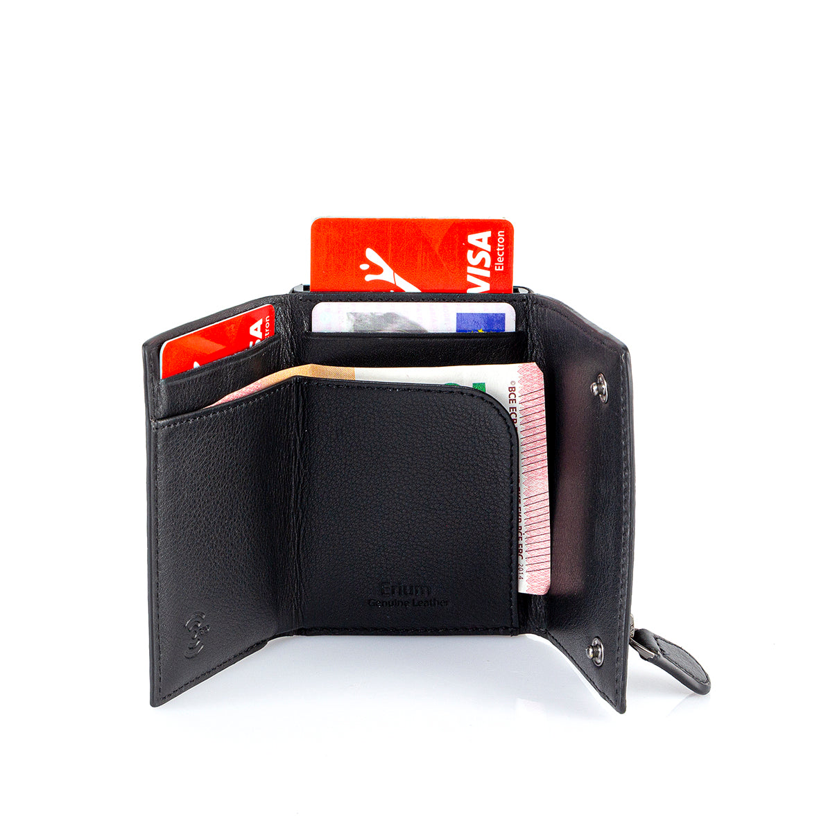 Carteira Erium com compartimento para moedas com fecho, caixa para cartões, compartimento extra para cartões e notas com molas magnéticas.