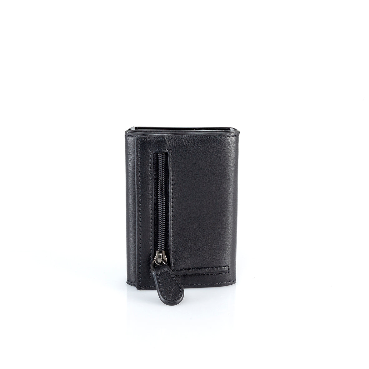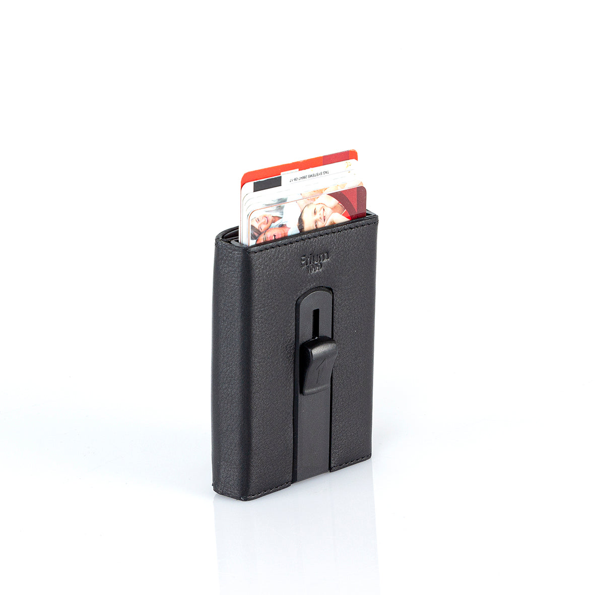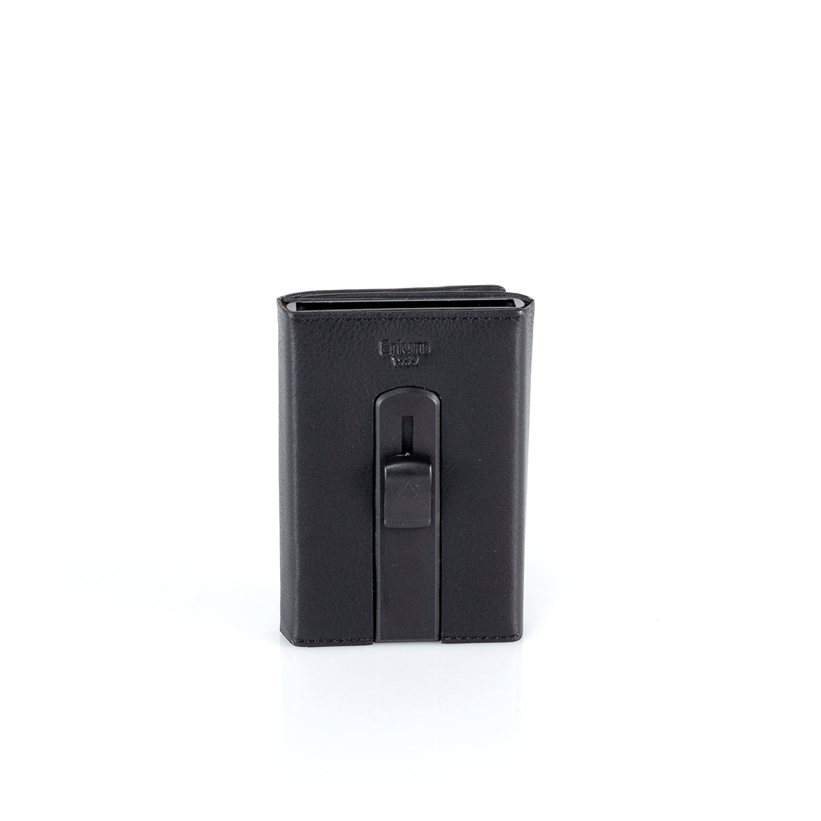 Carteira Erium com compartimento para moedas com fecho, caixa para cartões, compartimento extra para cartões e notas com molas magnéticas.