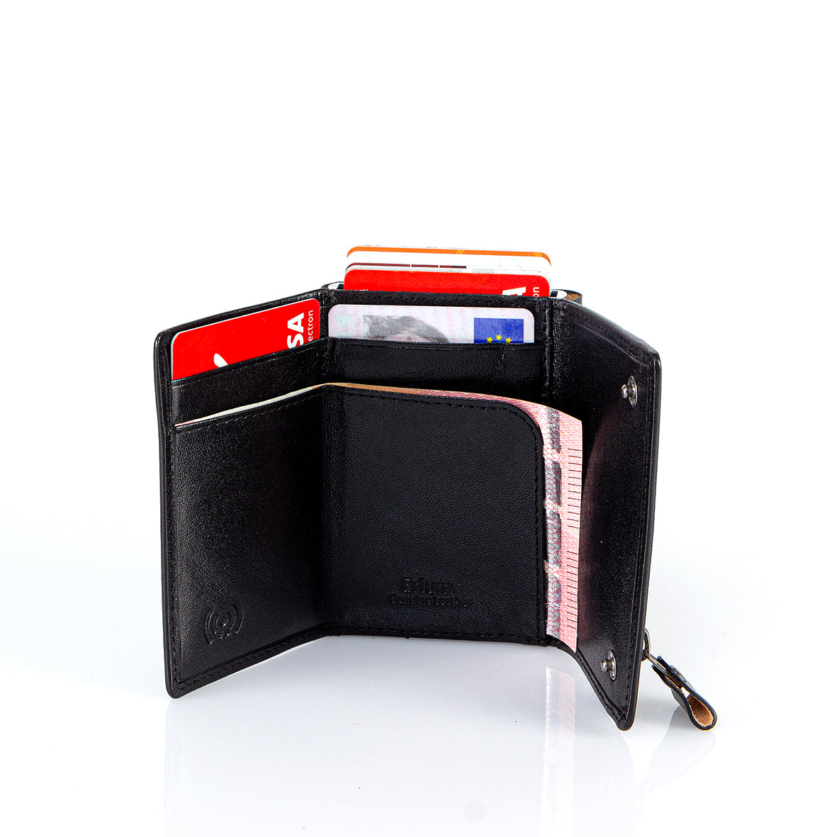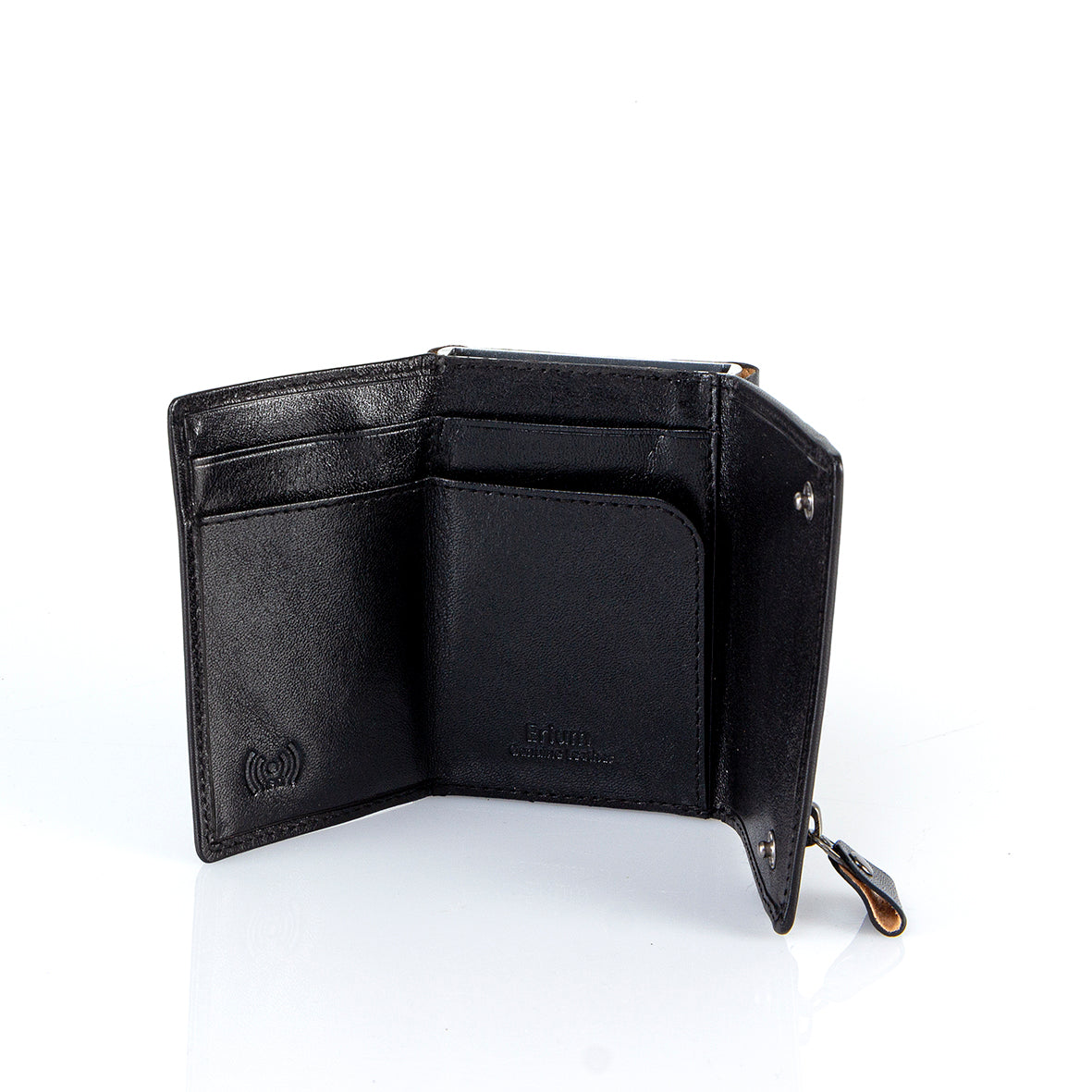 Carteira Erium com compartimento para moedas com fecho, caixa para cartões, compartimento extra para cartões e notas com molas magnéticas.